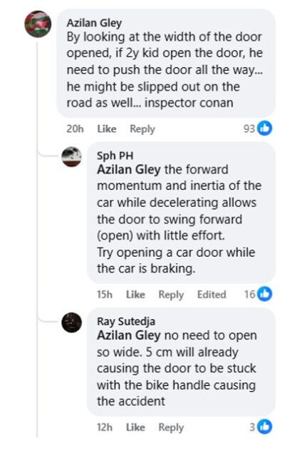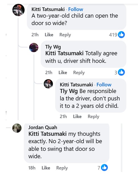 Could a two-year-old child swing the door so wide open? It was also insinuated that the driver (or even passenger) “cuci tangan” (pass the buck) by conveniently shifting the blame onto the hapless toddler.