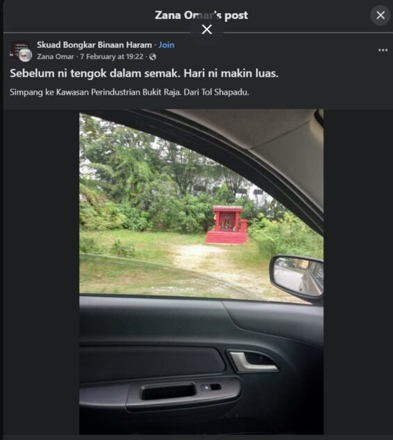 Interestingly, one exposé by Facebook group Skuad Bongkar Binaan Haram even zoomed in on one small red Na Tuk Kong (Datuk Gong) shrine by the roadside while identifying the location as “Junction to Bukit Raja Industrial Area. From Shapadu Toll” while claiming the structure “has expanded out of the bushes”.