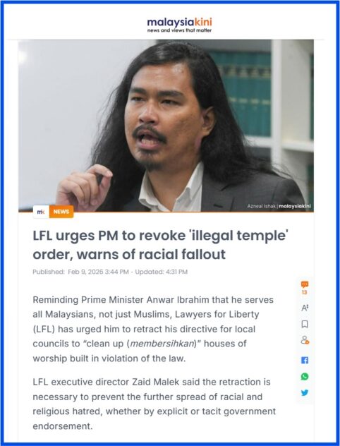 Against such grey areas, it is perhaps timely that Lawyers for Liberty (LFL) has urged PMX to retract his directive for local councils to “membersihkan (clean up)” houses of worship built in violation of the law while reminding the latter that he serves all Malaysians, not just Muslims.