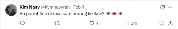 But that didn’t stop @MohamadFah10599 from wondering if it would taste good with curry. More frightening was @AdmFairuz who said the fish tasted like crab meat, which could mean only one thing. Then there was @kymnasyrah injecting some comedy by asking if the Parrot Fish tastes like a bird or a fish.