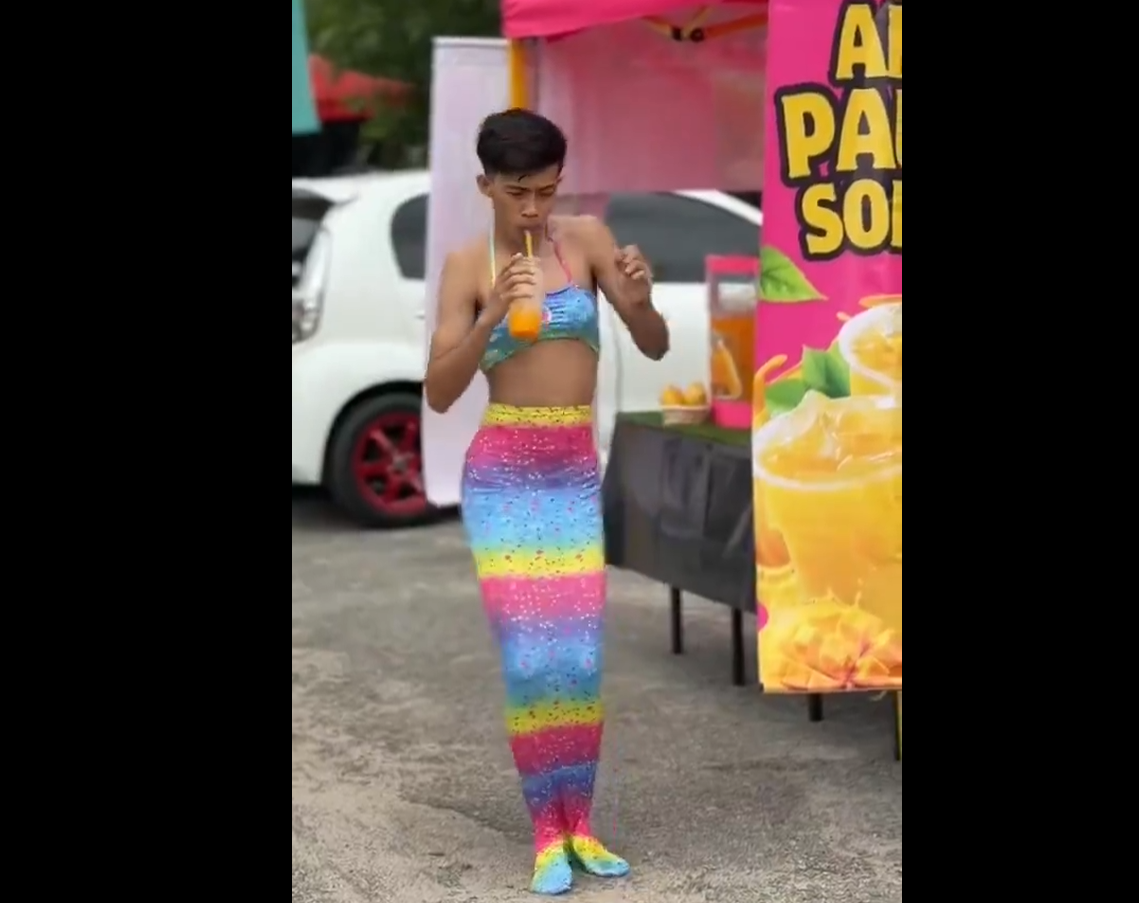 In the video post by netizen @dahfollowbelum, a young chap could be seen slurping from a chilled drink while he dances, scantily clad in a mermaid costume.
