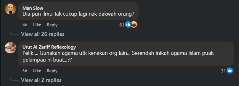 Others are of the view that Firdaus’ knowledge of Islam “is not deep enough to preach” with one reflexologist berated the use of religion to attack others, “thus undermining the dignity of Islam”.