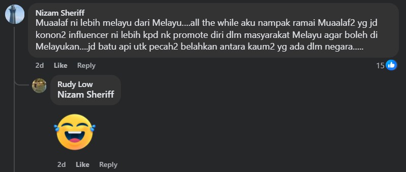 “All this while, I see that many mualaf who are so-called influencers are more interested in promoting themselves within the Malay community so that they can be Malay-nised … as if they want to be batu api (instigator) to disrupt racial unity/harmony in the country.”