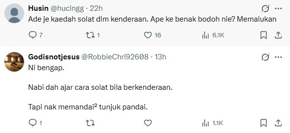 “This is crazy. The Prophet has taught us how to pray when travelling in a vehicle,” another hit out. This is nothing more than wanting to show off.”