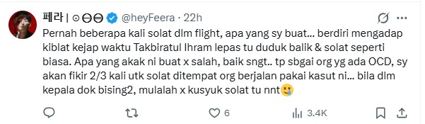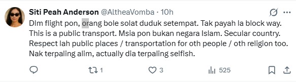 One commenter went on to share his “solat (prayers) experience during flights” whereby he stood “facing the Qibla for a moment during Takbiratul Ihram then sat back down and prayed as usual”.