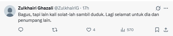 A few Muslims reminded the woman passenger not to complicate matters by just “pray by sitting down” given Islam is both simplistic and practical. “It’s even safer for her and the other passengers,” quipped one commenter.