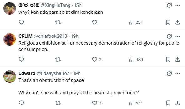 This is when some presumably non-Muslims entered the fray with one labelling her as a “religious exhibitionist for her unnecessary demonstration of religiosity for public consumption” and “obstruction of (public) space” for she could have waited to pray at the nearest prayer room.