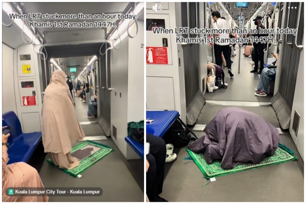 “Lately the LRT has been having frequent problems. Good that she’s already on standby with her prayer mat and telekung (prayer garment) .”