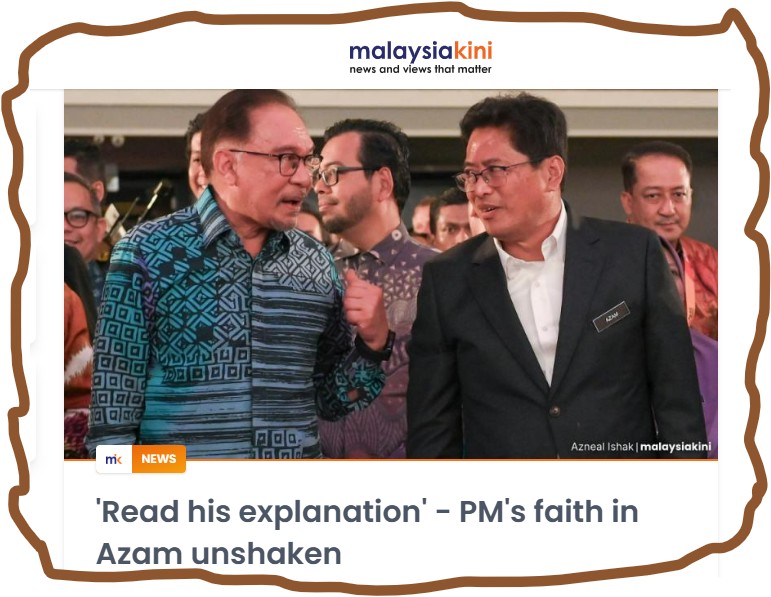 Azam’s involvement in the purchase of shares is cropping up and Anwar for whatever reasons seems determined to protect Azam to the extent he told the reporters that they had to listen what the MACC chief had to say about his share market purchases.