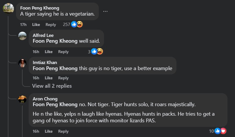 “A tiger saying he is a vegetarian,” mocked one Penangite with a Malaccan likening the deemed rabble rouser to being part of a hyena pack.