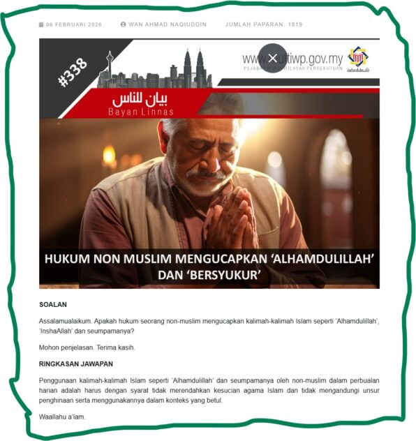 The divergent opinions highlight what a complex and sensitive issue this is. On the one hand, as sanctioned by the FT Mufti’s office and IKIM, there is nothing wrong with non-Muslims using these phrases in conversation and greeting.