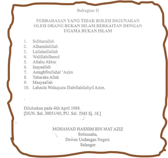 To substantiate his argument, the former Muslim Lawyers Association of Malaysia (PPMM) president referred to the Selangor Non-Islamic Religions Enactment 1988 which listed 10 so-called dhikr expressions that non-Muslims should not utter.