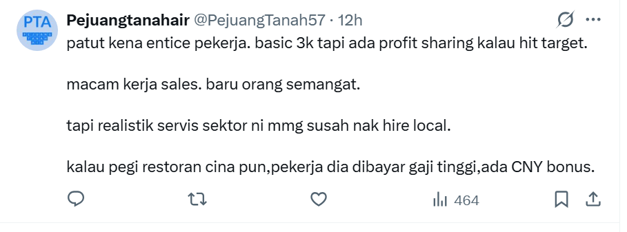 One commenter suggested a profit-sharing scheme as utilised by Pandan MP Rafizi Ramli for his ‘Ayuh Malaysia’ ventures to entice local workers. It was also claimed that workers at Chinese eateries could look forward to higher salaries alongside Lunar New Year ang pows.