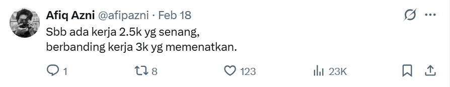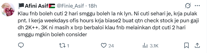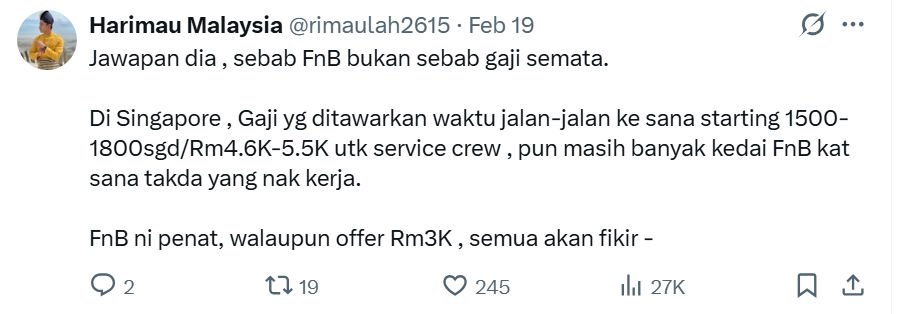 It’s not all about the money. Another commenter pointed to Singapore to highlight the shortage of labour in the F&B industry despite attractive wages of up to SG$1800/RM4.6-5.5K for service crew. Many would think long and hard as F&B is a tough work despite the RM3K on offer.