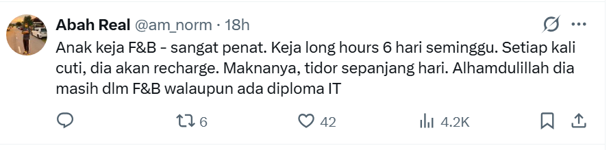 One concerned mother shared that her exhausted son would sleep the entire day just to recharge after a week’s hard toil. However, the young man is still preserving in the F&B industry despite having a Diploma in IT.