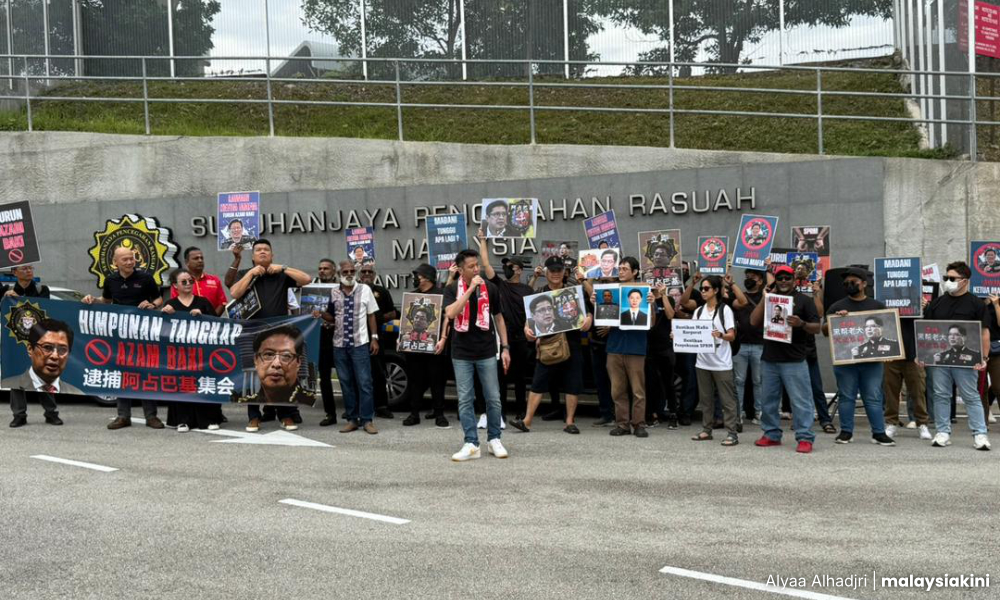 Protesters, under the watch of MACC and police personnel, raised placards with images of Azam and called for his arrest.