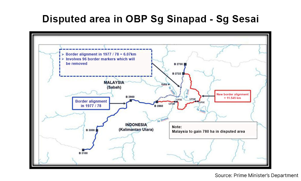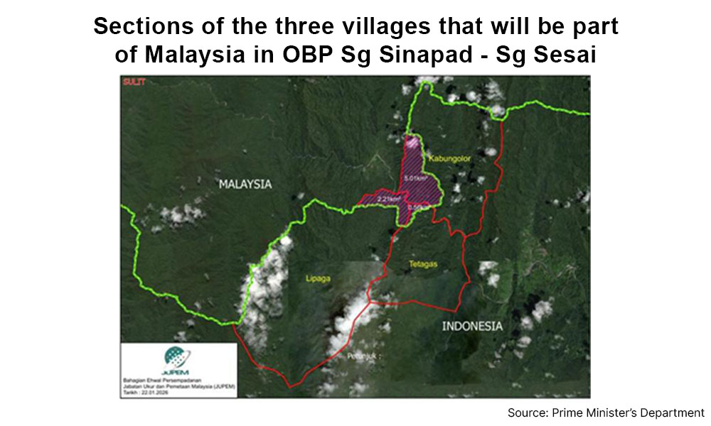 As part of the settlement, sections of three villages that had been part of Indonesia - Kabulangor, Lepaga, and Tetagas in Sungai Sinapad-Sungai Sesai OBP - will be part of Malaysian territory.