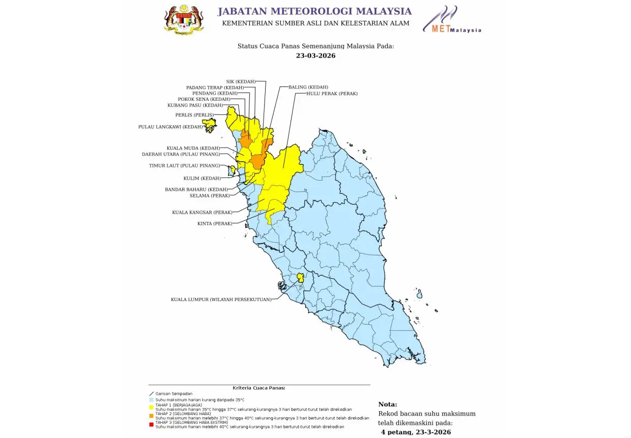 Three places in Kedah have reported to be in level 2 heatwave alert, which means the daily maximum temperature is above 37°C up to 40°C for at least 3 consecutive days.