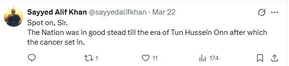 Something to which the liberal-minded Sayyed Alif Khan suggested the timeline of decline: “Spot on, Sir. The nation was in good stead till the era of Tun Hussein Onn (Malaysia’s third premier) after which the cancer set in.”