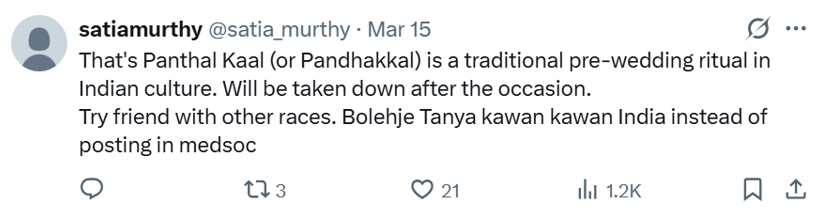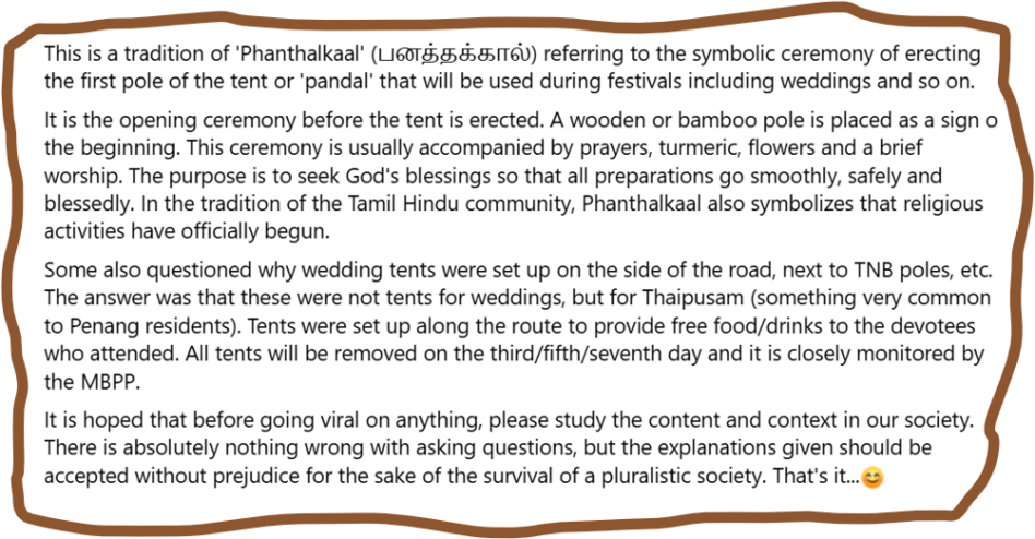 Although several presumably Hindu commenters have also pointed out that this was probably the start of a religious ceremony – most likely the recent Thaipusam or wedding celebrations – this poster has seen fit to NOT take down the post nor edit it in a way to reflect the true nature of the scenario.