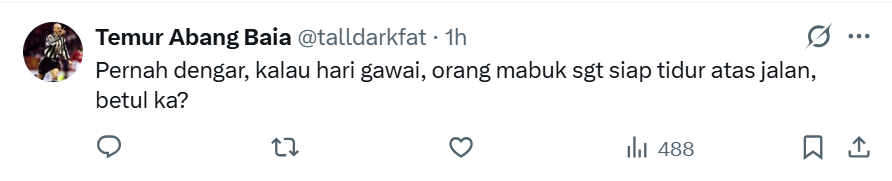 Netizen @datukhensem who made the post added that people in Sarawak have a slogan for those who were drunk, “udah mabuk, tinduk,” which means, when you are drunk, go and sleep.