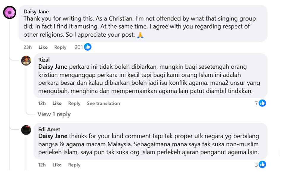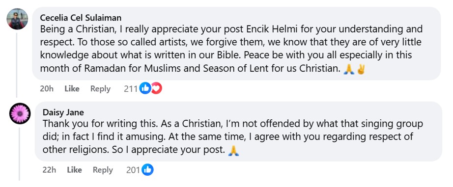 First and foremost, Muslims should not dabble in Christian iconography – satire or otherwise. Secondly, it shows a lack of respect for “our Christian friends here in Malaysia”.