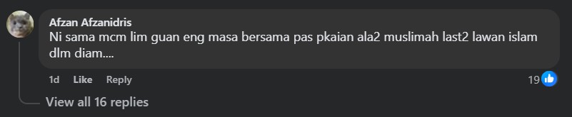 Drawing parallel with DAP advisor Lim Guan Eng, one commenter even warned Muslims against the make-believe “donning of moderate Muslim garb” by recounting a similar trend when the party and PAS were allies in the Pakatan Rakyat (PR) coalition but “lastly fight Islam in silence”.