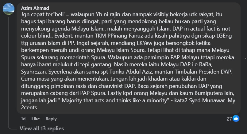 “Remember history, the late Lee Kuan Yew also wore a songkok while campaigning to win the votes of Singaporean Malay Muslims. But look at the level at which the Singaporean Malays are now ruling Singapore,” reminisced one commenter while unveiling a somehow chilling reality.