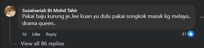 “What’s so great about wearing a baju kurung … The late Lee Kuan Yew used to wear a songkok to enter when entering a Malay kampung … Nothing more than a drama queen,” jibed one hater to a Facebook post of Yeoh gracing the Nur Ramadan Programme 2026 in Putrajaya recently.