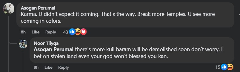 While rational members of the Indian community sought to seek harsh punishment on the suspect in regardless of race and religion, the less forgiving ones continued to harp on the law of karma and “the eventual consequences of breaking more temples”.