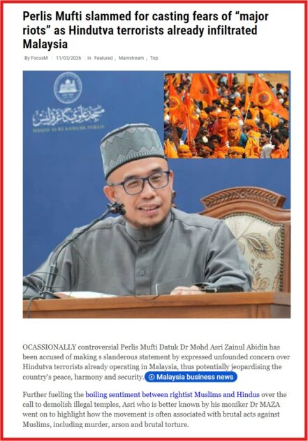 A religious expert in the service of a state government in Peninsula Malaysia (Perlis mufti Datuk Dr Mohd Asri Zainul Abidin a.k.a. Dr MAZA) has urged the country to keep track of the religious activities of the Hindutva elements especially those who manage and operate Hindu temples in the country.