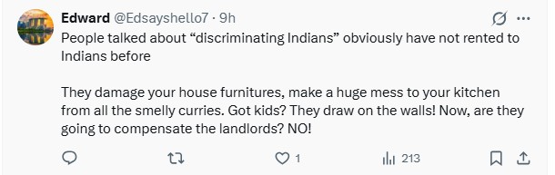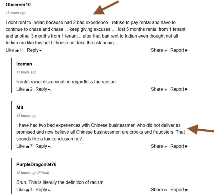 This was backed up by another commenter who presumably spoke from experience for having deduced that “people (who) talked about ‘discriminating Indians’ obviously have not rented to Indians before”.