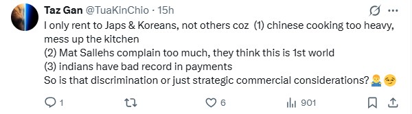 “They damage your house furniture, make a huge mess to your kitchen from all the smelly curries. Got kids? They draw on the walls! Now, are they going to compensate the landlords? NO! ,” he fumed.
