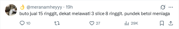 Take it from @meranamheyyy who said people were selling caramel cake at RM8 for three slices in Melawati. However, @xxx_wcc countered that those cakes are about half an inch in height only.
