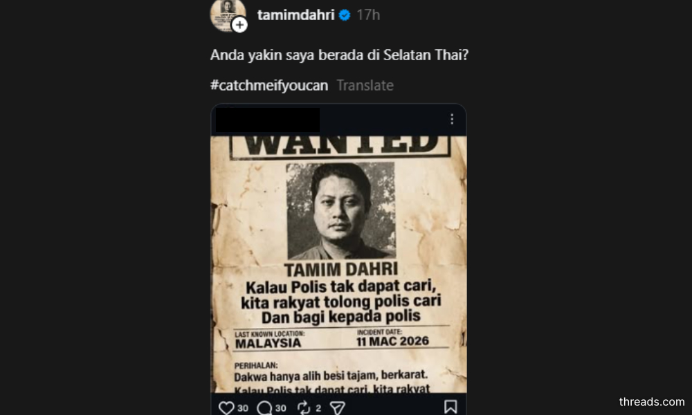 The activist, Tamim Dahri Abdul Aziz, had, in a brief post on Threads yesterday, questioned whether those seeking his arrest were certain of his whereabouts in southern Thailand.