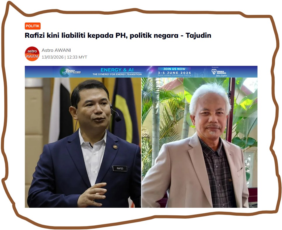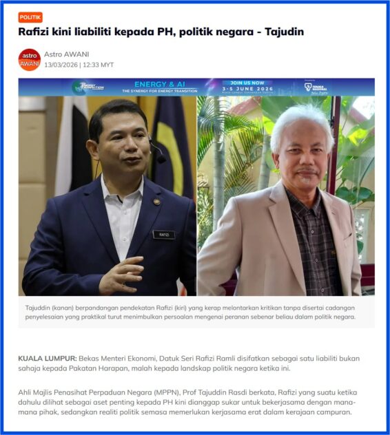 FORMER economy minister Datuk Seri Rafizi Ramli has taken a swipe at pro-Madani political observer/commenter Prof Tajuddin Rasdi who recently claimed that the former has shifted “from being a Pakatan Harapan (PH) asset to someone who is difficult to cooperate with any party”.