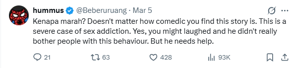 Also, @Beberuruang pointed out that the man is suffering from a serious case of sex addiction. “Yes, you might laughed and he didn’t really bother people with this behaviour. But he needs help,” he said.