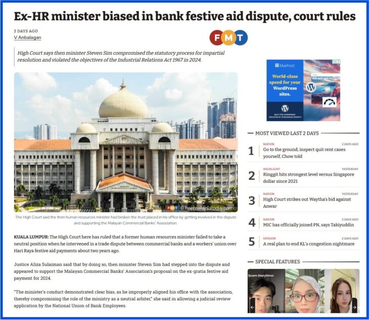 The latest brickbats hurled at the Entrepreneur and Cooperatives Development Minister came about after the Kuala Lumpur High Court ruled that he had failed to take a neutral position when he intervened in a trade dispute between the Malayan Commercial Banks’ Association (MCBA) and the National Union of Bank Employees (NUBE) when he was the human resources minister.