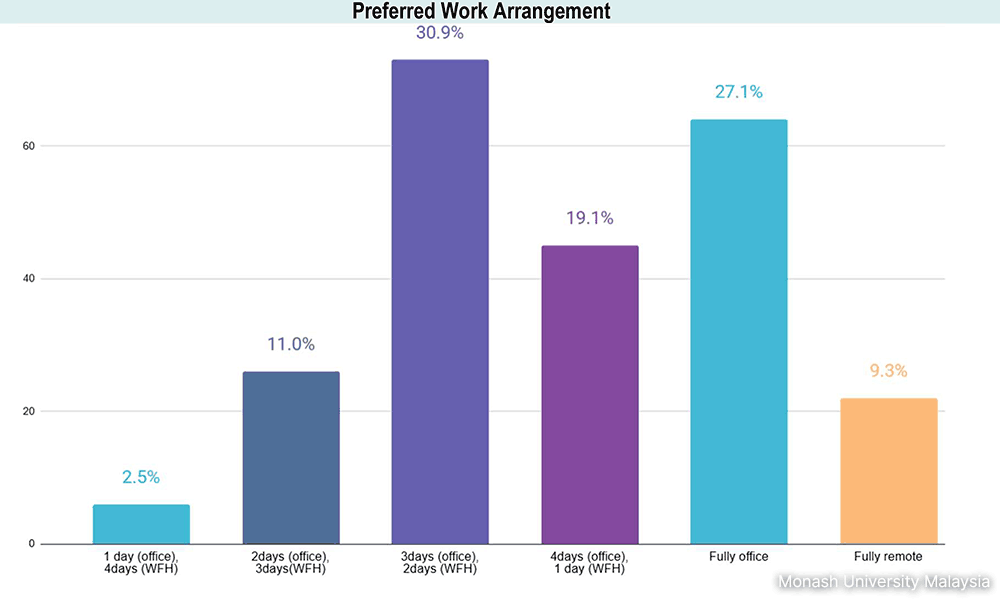 The survey by Monash University Malaysia found that 80.5 percent of white-collar respondents to the survey are working fully on-site, compared to three percent working remotely and 16.5 percent working in a hybrid arrangement.