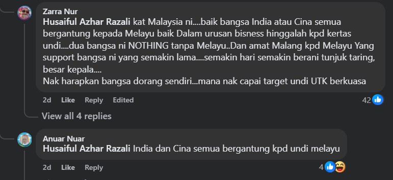 This was when one fellow rightist lamented how Chinese and Indian politicians are both dependent and “are nothing without Malay votes so much so it’s so unfortunate for Malays to support both races who are getting big-headed by the day”.