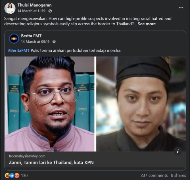 This was in reaction to Inspector-General of Police (IGP) Datuk Seri Khalid Ismail then statement that joint founders of the Gerakan Anti Rumah Anutan Haram (GARAH) Zamri Vinoth and Tamrin Dahri Abdul Razak had fled to Thailand.
