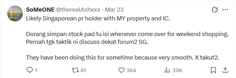 Apparently it is a common tactic to fuel up when they come over to shop during the weekend. @therealAshxxx added that such techniques were discussed in the Singaporean forums.