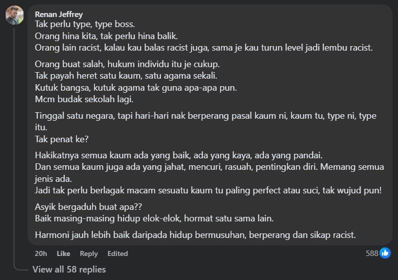 Interestingly, the commenter received thumbs up from the majority Malay audience who claimed that “we Type M don’t discriminate nor back up criminals, so just use the law against the offenders”.