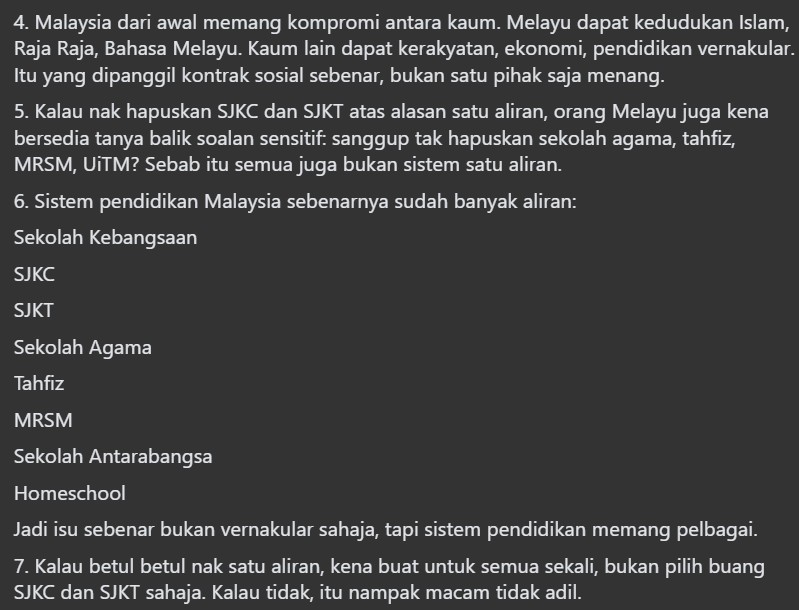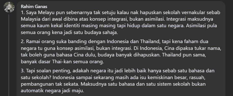 This is when a fellow Malay netizen expressed disagreement with the rightist’s call to abolish vernacular schools on grounds that “Malaysia was built on the concept of integration, not assimilation”.