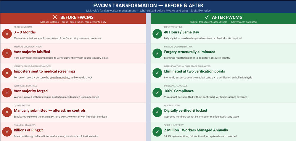 Before FWCMS, Malaysia’s foreign worker management ecosystem was manual, fragmented and vulnerable to abuse - with no digital records, no audit trail and no accountability. Ministries operated in silos with no integration.