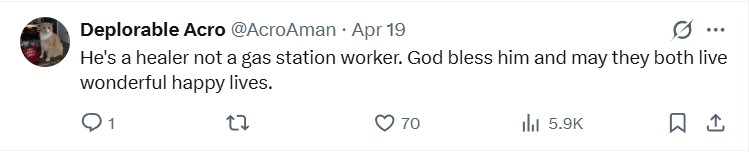 “He’s a healer not a gas station worker. God bless him and may they both live wonderful happy lives,” added @AcroAman.