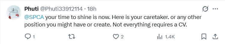 Also, @Phuti33912114 tagged SPCA in the comment, urging them to take the worker in as a caretaker.