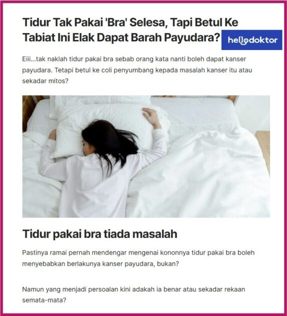Addressing this concern is a post on Public Health Malaysia Facebook portal which emphatically states that an international scientific study (American Cancer Society) confirms NO medical evidence linking sleeping bras to the risk of cancer.