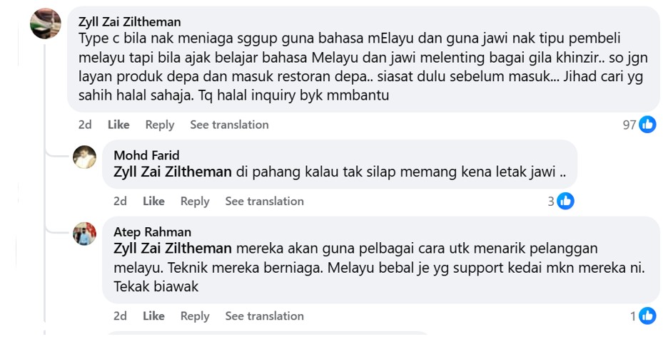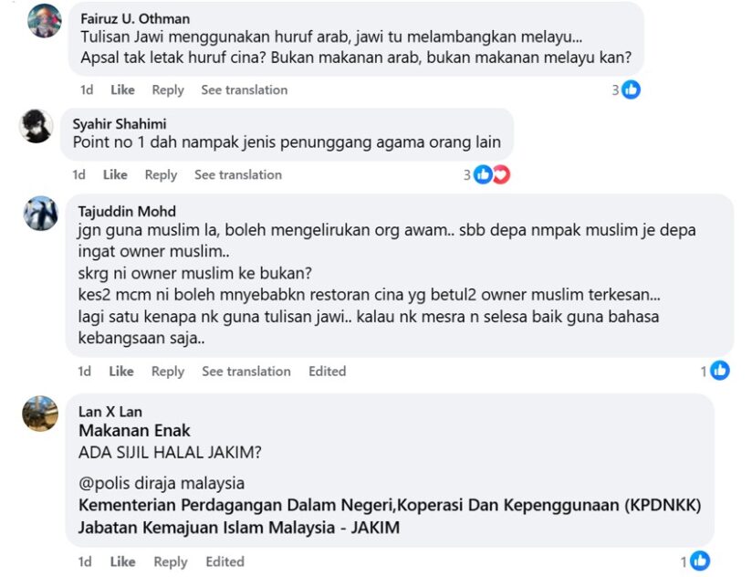 It was then pointed out that Jawi script in business signages was mandatory in Pahang (but funnily, that did not get as many ‘likes’ as the openly racist comments that asked to boycott such restaurants).