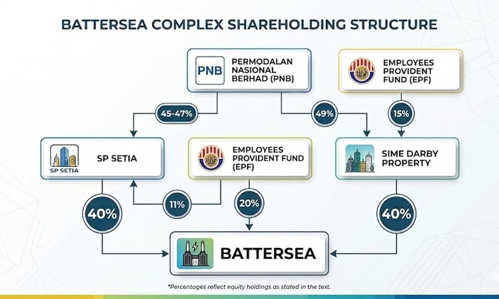 The main business of Battersea, the development of a high-end commercial development accompanied by luxury residences, is put under a holding company in Jersey, which is owned by two publicly listed companies in Malaysia and a pension fund.